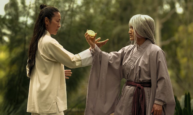 Saltando entre otras vidas alternativas que podría haber llevado, Evelyn recurre a los recuerdos y habilidades de sus otros yo para defenderse, incluyendo una chef Teppanyaki y una cantante de ópera. En un bonito guiño al estatus de Yeoh como estrella mundialmente reconocida gracias a películas como Tigre y dragón, uno de sus otros yos más significativos es una famosa actriz entrenada en artes marciales.