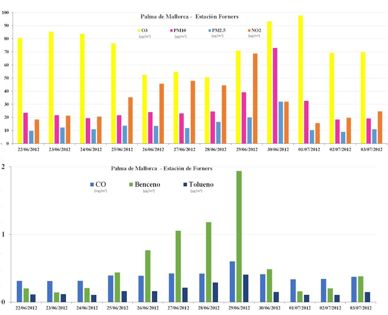 En Palma de Mallorca se registraron concentraciones de 73 μg/m³ para PM₁₀ y 32 μg/m³ para PM₂,₅. Además, se observó un incremento de la concentración de O₃ (97,8 μg/m³) y CO (0,6 mg/m³), e incluso, de los COV benceno y tolueno (alcanzando valores de 1,9 y 0,4 μg/m³, respectivamente). Aunque hay que decir que no se superaron los valores límites de estos últimos contaminantes.