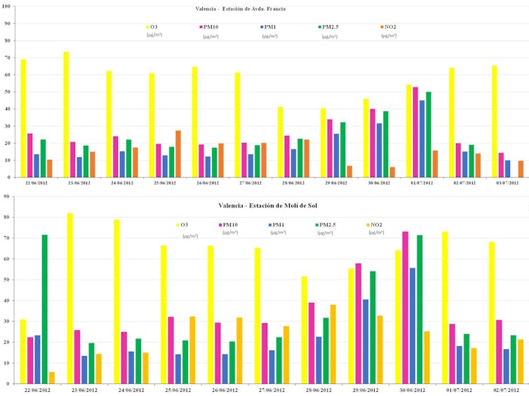 En la figura 3 se muestran las concentraciones promedio diarias de los contaminantes medidos en dos estaciones de Valencia y otra estación de Palma de Mallorca, desde el 22 de junio (mucho antes de comenzar el incendio) hasta el 3 de julio de 2012.
