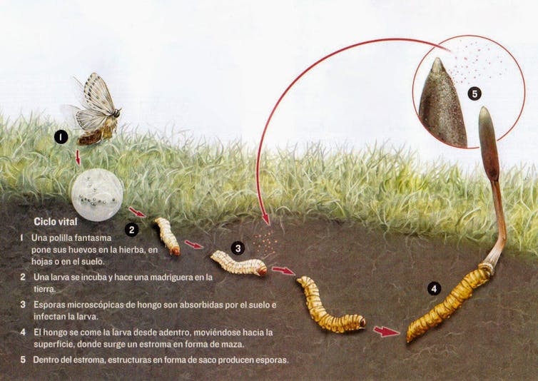 Durante el otoño, el micelio infecta a la oruga viva que crece enterrada e invade su cuerpo. Para crecer, el hongo absorbe todos sus nutrientes del cuerpo de la oruga. Hacia el verano del año siguiente, después de consumirla completamente, la infección ha matado a la oruga, pero dejando intacta su piel.