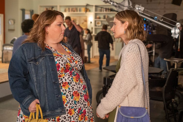 El personaje de Kate también reproduce otros mandatos de género, como la búsqueda de la belleza y el anhelo de la maternidad. En el primer caso, aunque lucha contra el sobrepeso y los cánones de belleza actuales, su aspecto siempre luce cuidado, mostrando su capacidad para cumplir con la “feminidad” a pesar de no poseer un cuerpo no normativo. En el segundo, su objetivo de tener un hijo articula una narrativa de la maternidad como destino y realización.