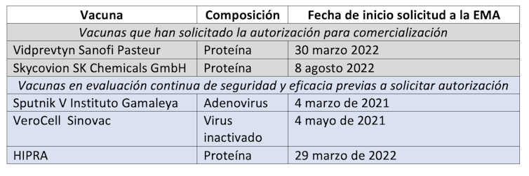 Hay dos vacunas esperando la autorización de la EMA para ser comercializadas y distribuidas: Skycovion y Vidprevtyn, ambas basadas en proteínas. Además, la agencia europea ha iniciado la revisión continua de datos de ensayos clínicos como paso previo a la autorización de otras tres vacunas que ampliarán el arsenal de vacunas disponibles.