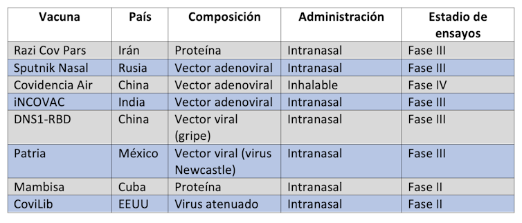 La primera vacuna de mucosas que se aprobó en un país fue la Razi Cov Pars, producida por Irán, que consiste en dos dosis inyectables y una tercera intranasal y se encuentra en fase III de ensayos clínicos, aunque en Irán está autorizada desde octubre de 2021. La siguiente, en abril de este año, fue la rusa Sputnik Nasal, basada en el mismo vector adenoviral que la inyectable.