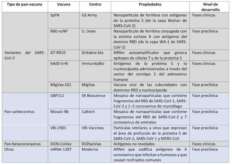 En la actualidad se está trabajando en el desarrollo de panvacunas que actúan en diferentes subgéneros, como el subgénero de los sarbecovirus (que incluye todos los virus similares al SARS), los betacoronavirus (similares al MERS) y algunos coronavirus estacionales que causan el resfriado común.